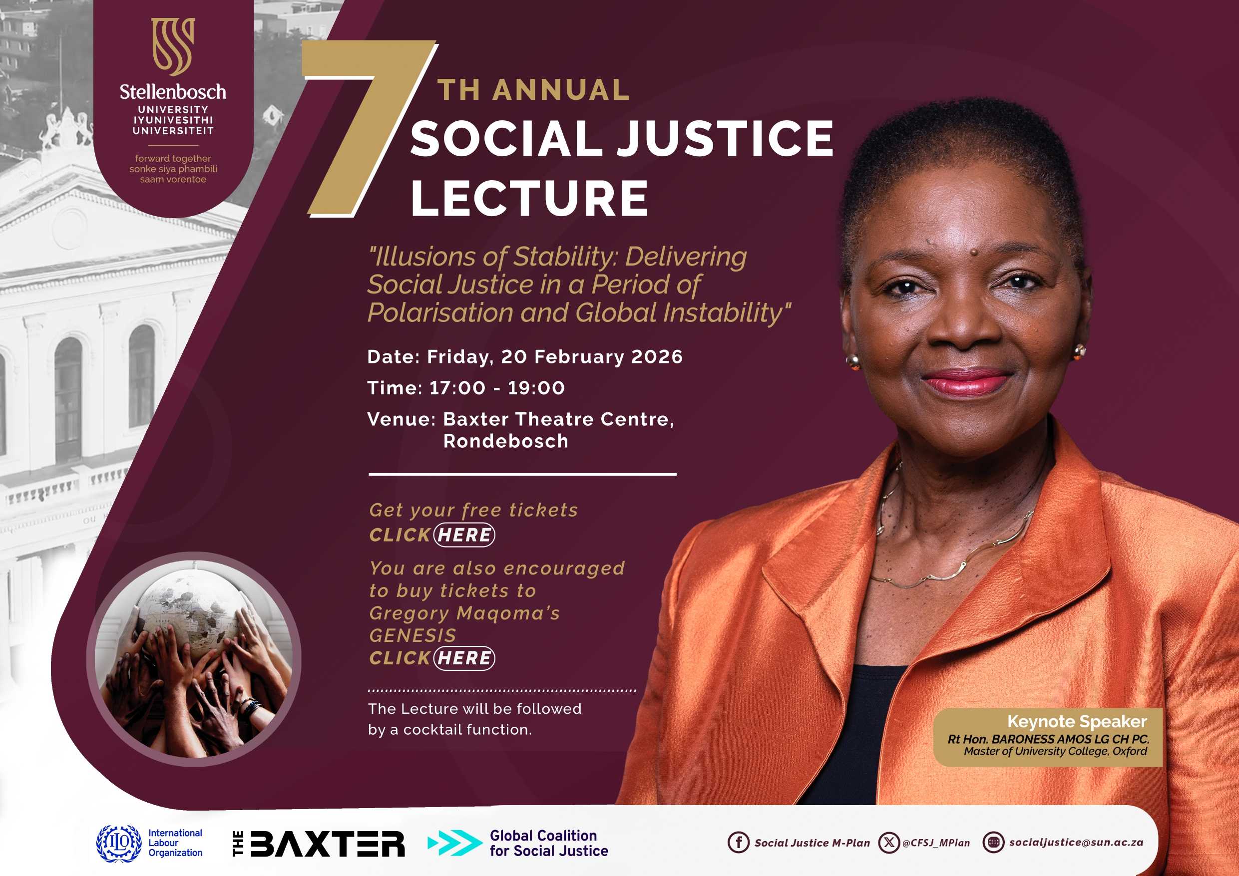 The Annual Social Justice Lecture (“SJ Lecture”) is hosted by Professor Thuli Madonsela, in her capacity as the Director of the Centre for Social Justice (“CSJ”) at Stellenbosch University. The annual lecture is arranged in commemoration of World Social Justice Day, annually observed on 20 February.The Lecture is part of